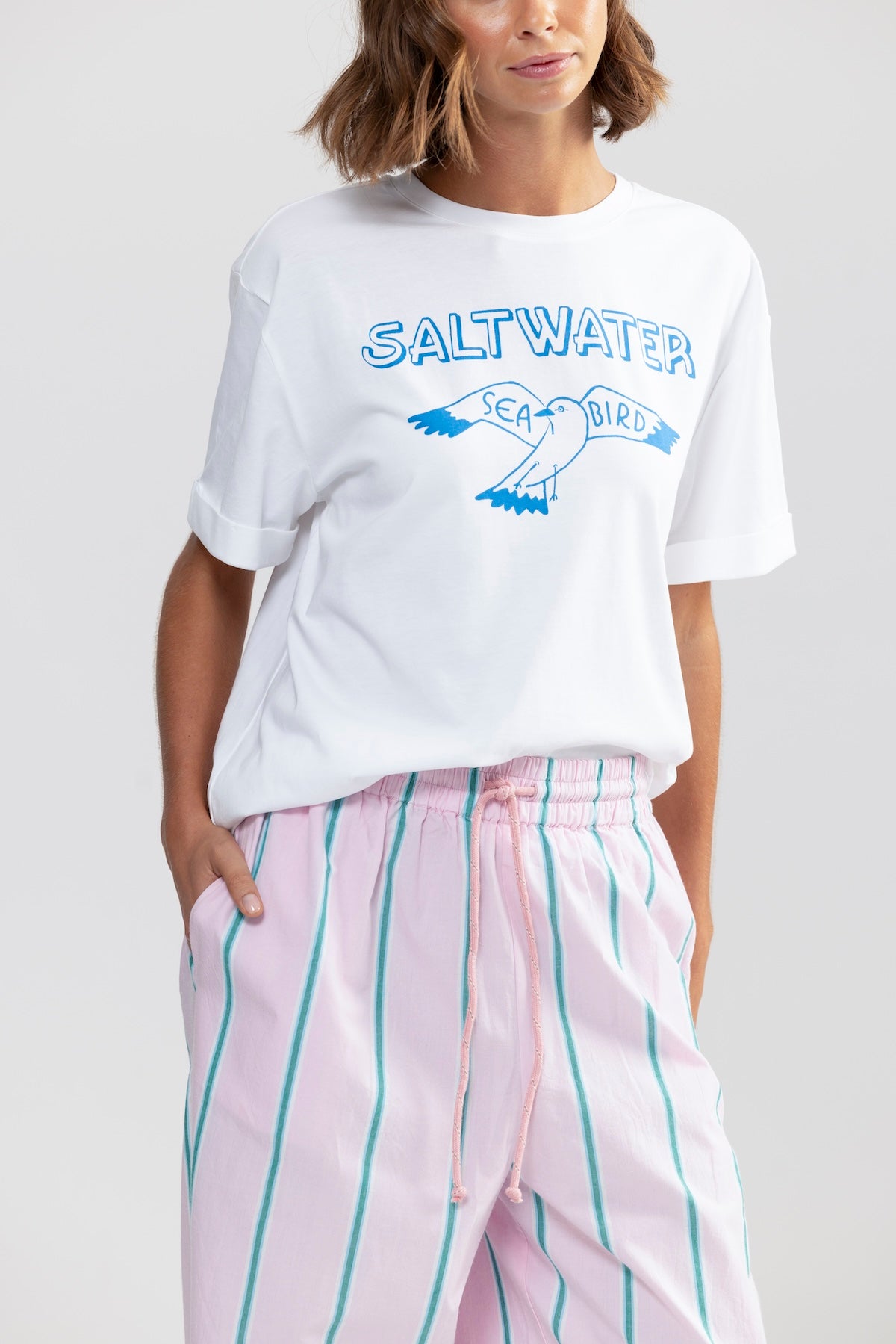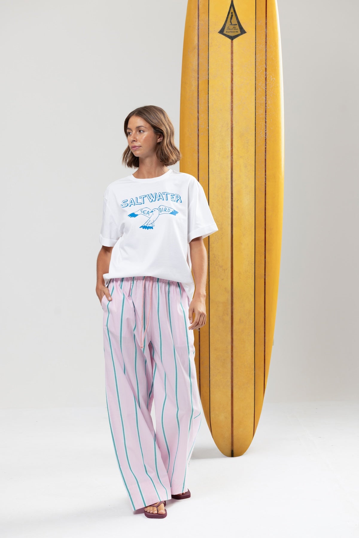 For days when your only plan is absolutely nothing - but you still want to look like you’ve got a beach house and strong opinions on tide charts. These 100% yarndye baby pink, green & white stripe cotton wide-leg pants bring just the right amount of easy breezey lemon squeezy. Best styled with bare feet, sea salt-sprayed very messy ponytail, natural glowy relaxed faces & a deep commitment to doing as little as possible. Or you could pair it back with our SHE SELLS SEASHELLS shirt or our SEAGULLS t shirt with white kitten heels, white linen blazer & look incredibly chic. Multi tasker. Just like your fine self.
