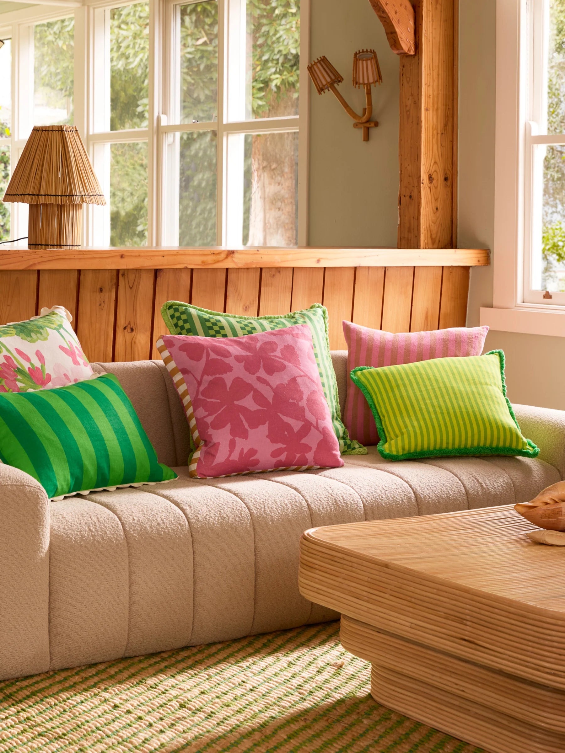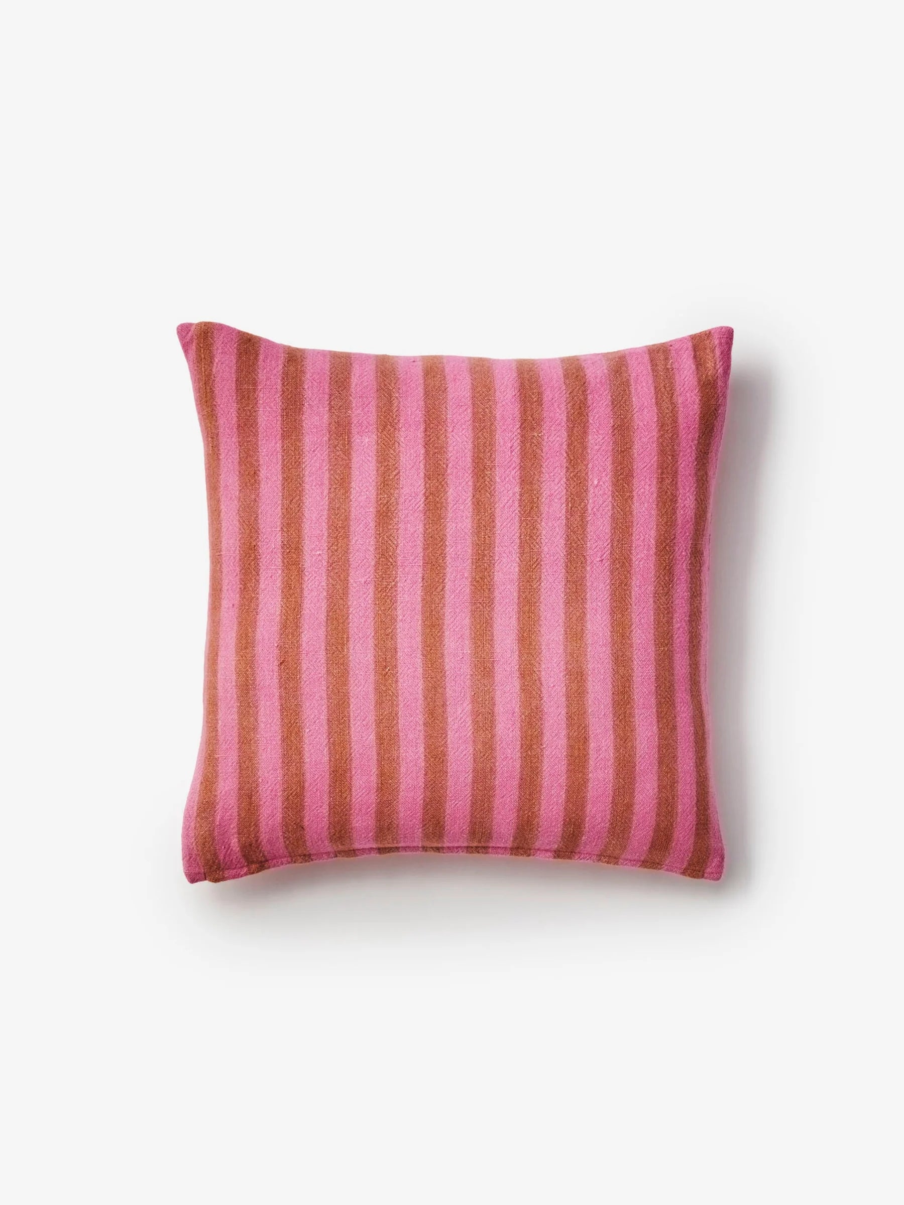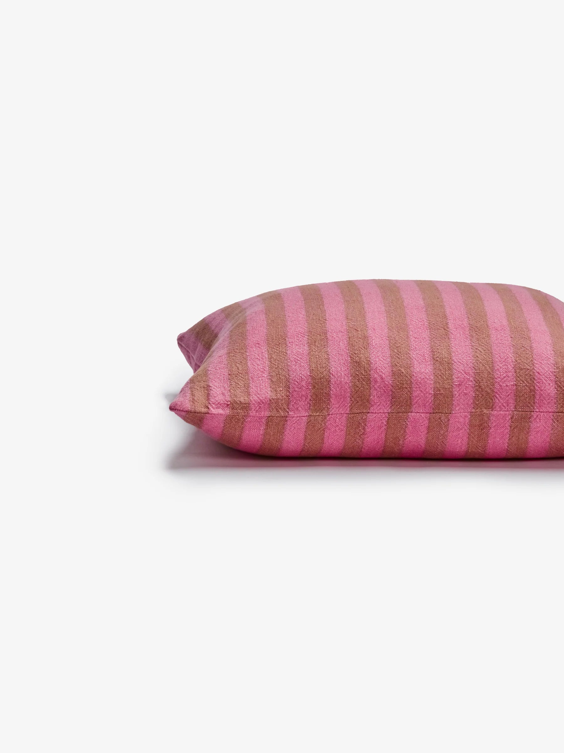 Bold, bright, and brimming with retro energy, Linear in Candy brings playful rhythm to your space. A pink and tan triped linen cushion that adds instant contrast.