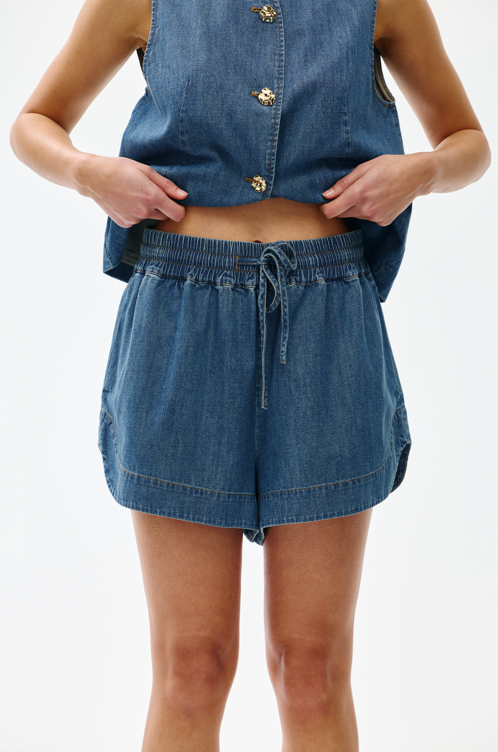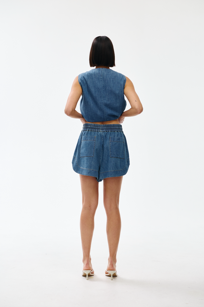 The Juniper Short Denim is made in our classic, flattering short shape. They feature in-seam pockets, an elasticated waistband and waist-tie.