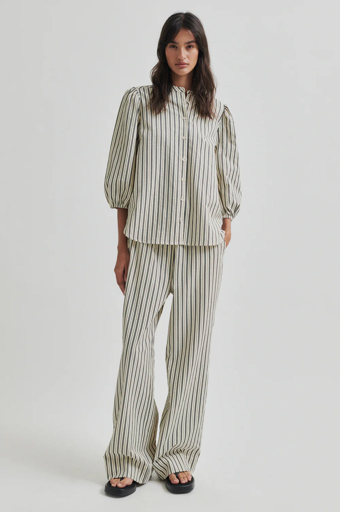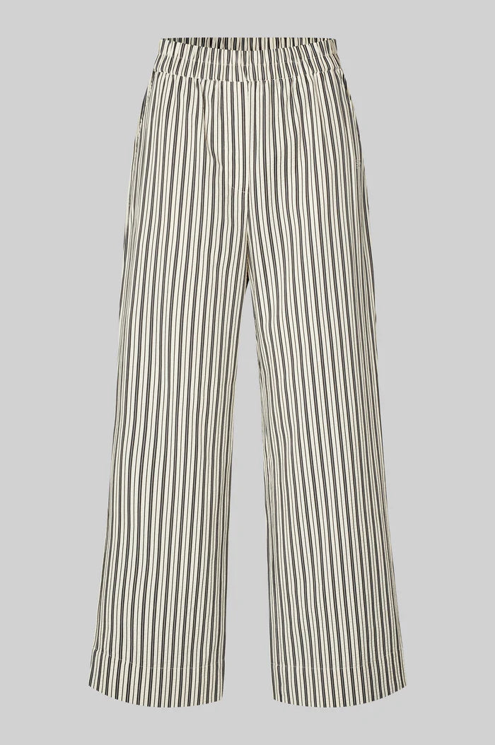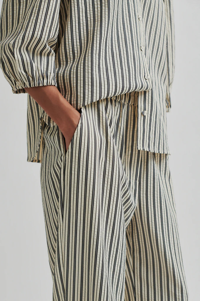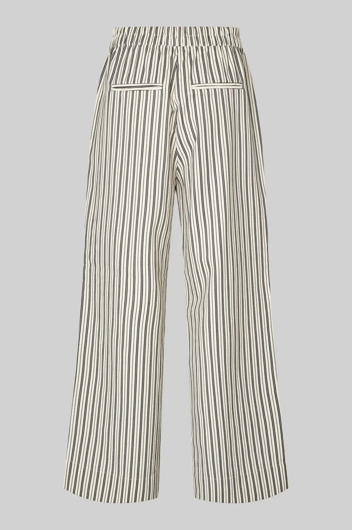 Second Female striped trousers. The trousers are made in a cotton blend with slight seersucker structure. Featuring a covered elasticated waistband and decorative fly at the front. Two slanted pockets at the front and two decorative pockets at the back. Regular waist with straight, wide leg.
