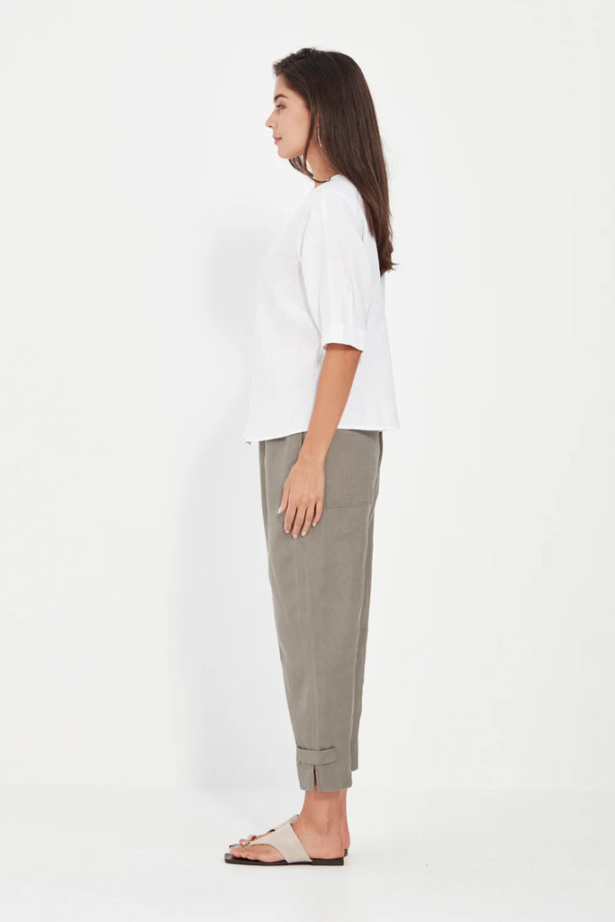 Crafted from 100% linen, the Elena Pant offers an easy, relaxed fit with a tapered leg that finishes at the ankle. An elasticated waistband ensures comfort, while panel detailing through the front and back adds subtle structure. Side pockets, back patch pockets, and a split hem accented with herringbone tape complete this effortlessly stylish silhouette.