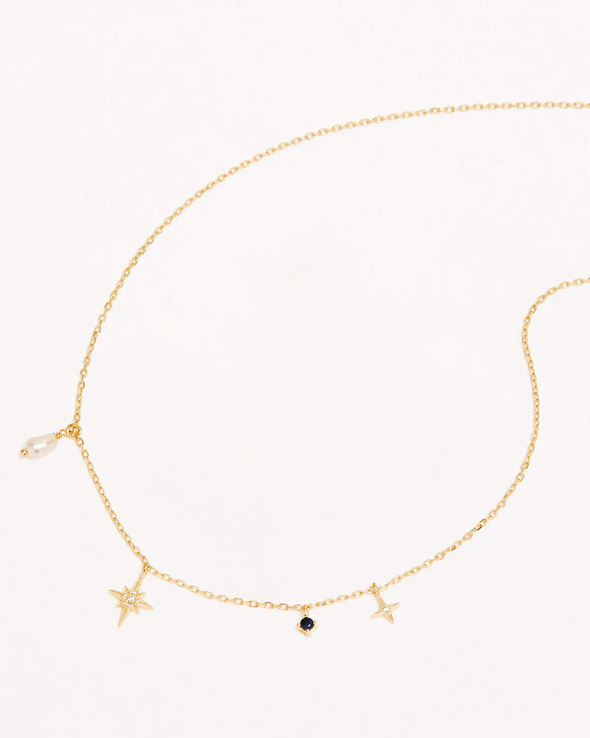 Layer yourself in the heavens with our Stardust Choker, a delicate adornment that weaves together each beautifully unique element of the night sky. Our choker features a Freshwater Pearl which symbolises the illuminating moonlight, a divine Sapphire for the infinite night sky, and two crystal encrusted Stars for the celestial bodies that eternally guide us.