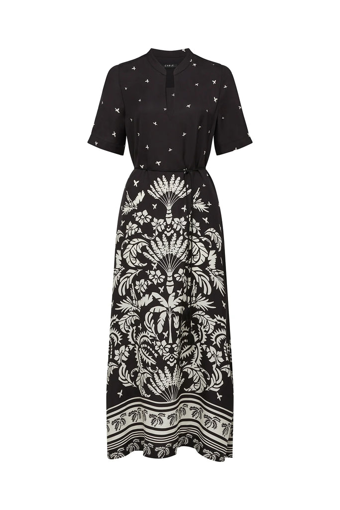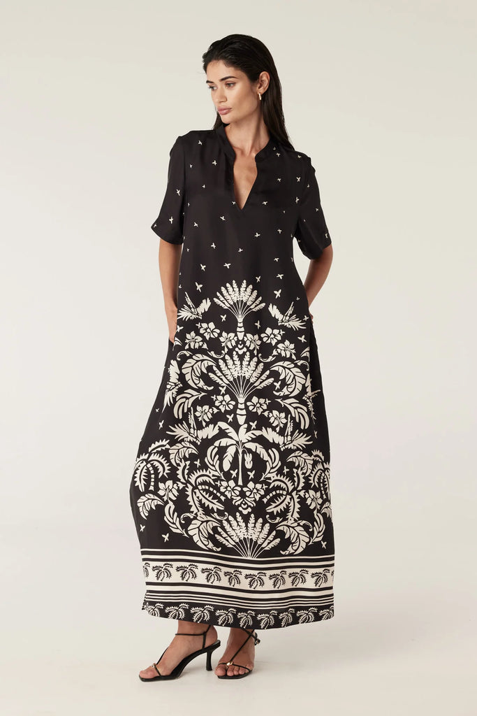 The Twilight Kaftan Dress features a relaxed fit with a stand collar and side splits. Made from a lightweight and breathable silk blend twill fabric with an exclusive print. This kaftan includes a removable waist tie with tassel detail for versatile styling.