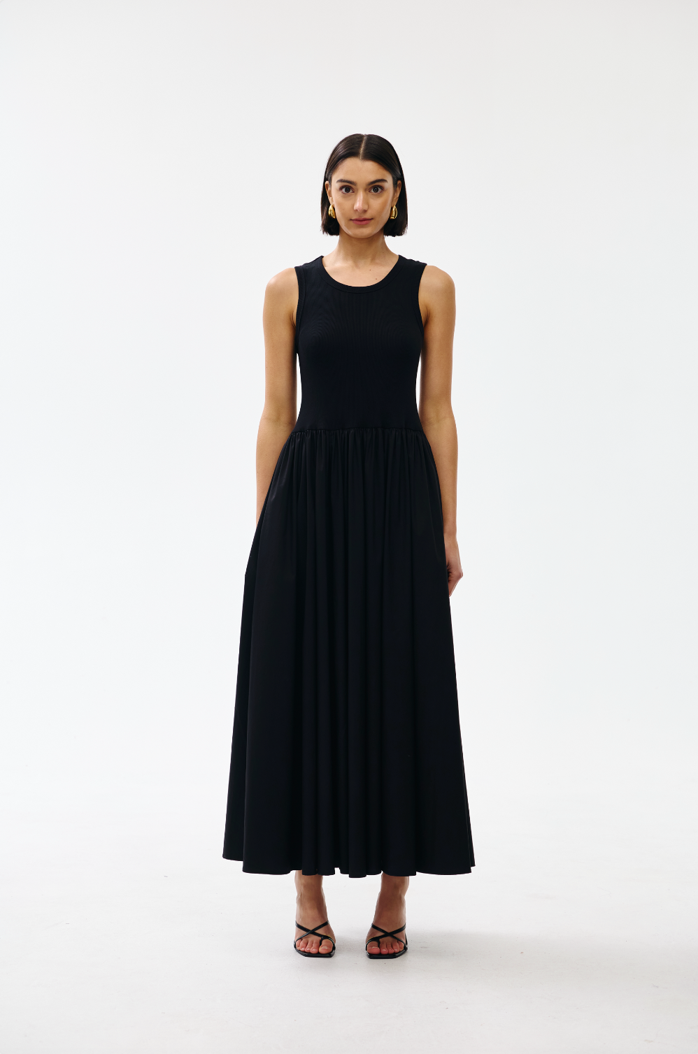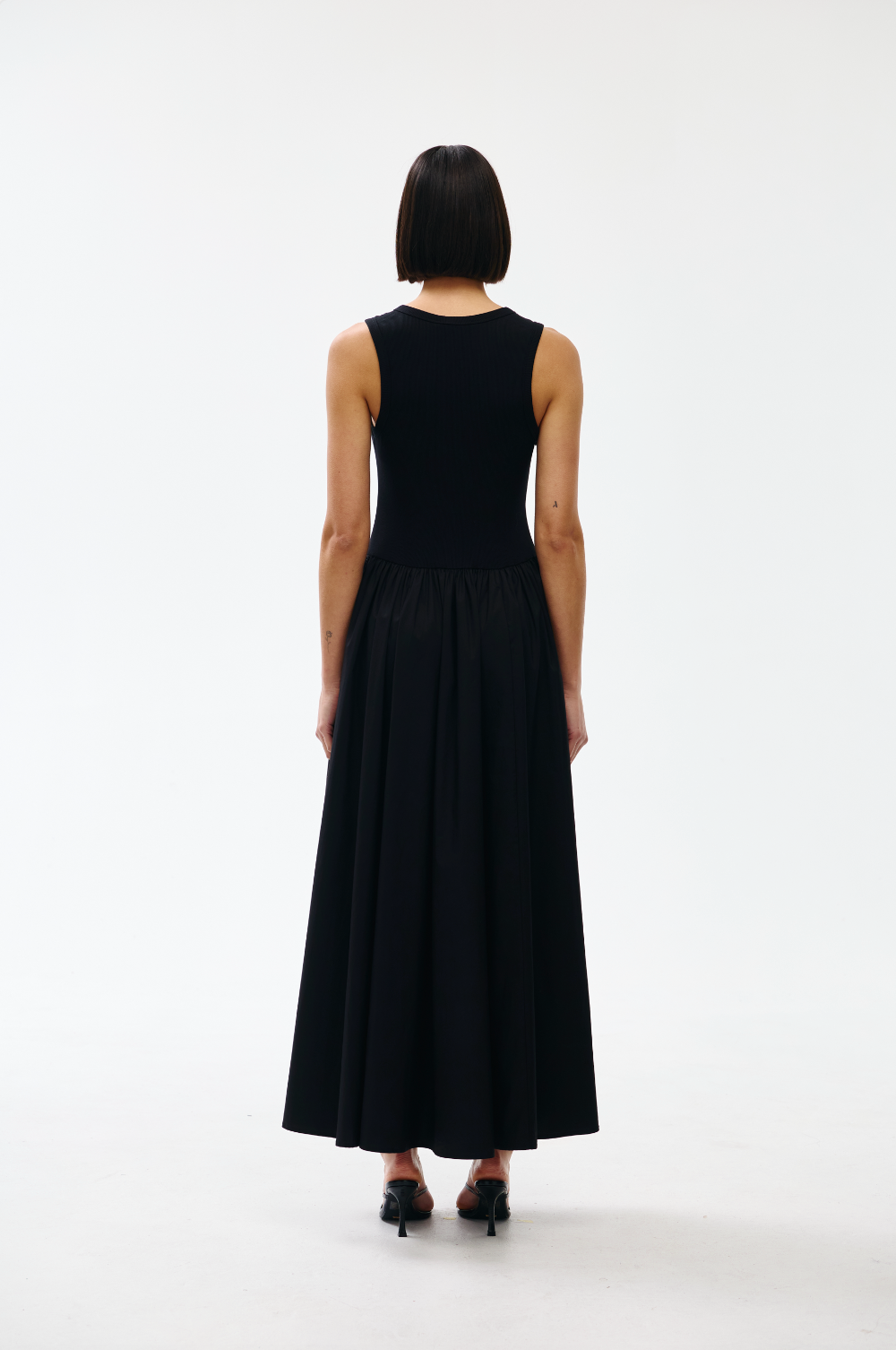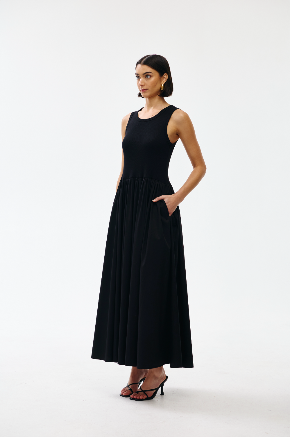 This sleeveless silhouette features a high neckline and a gently fitted waist that flows into a softly flared skirt.