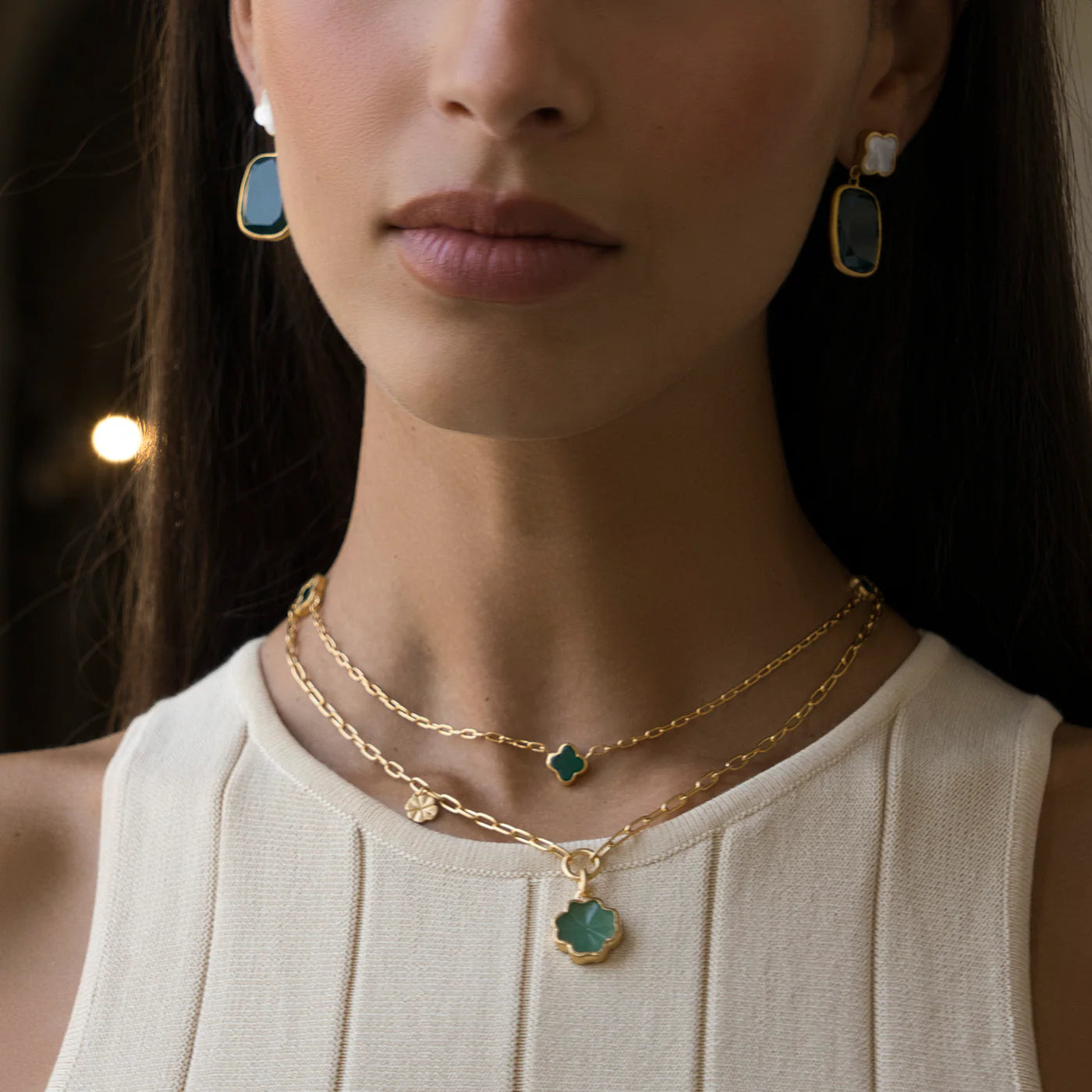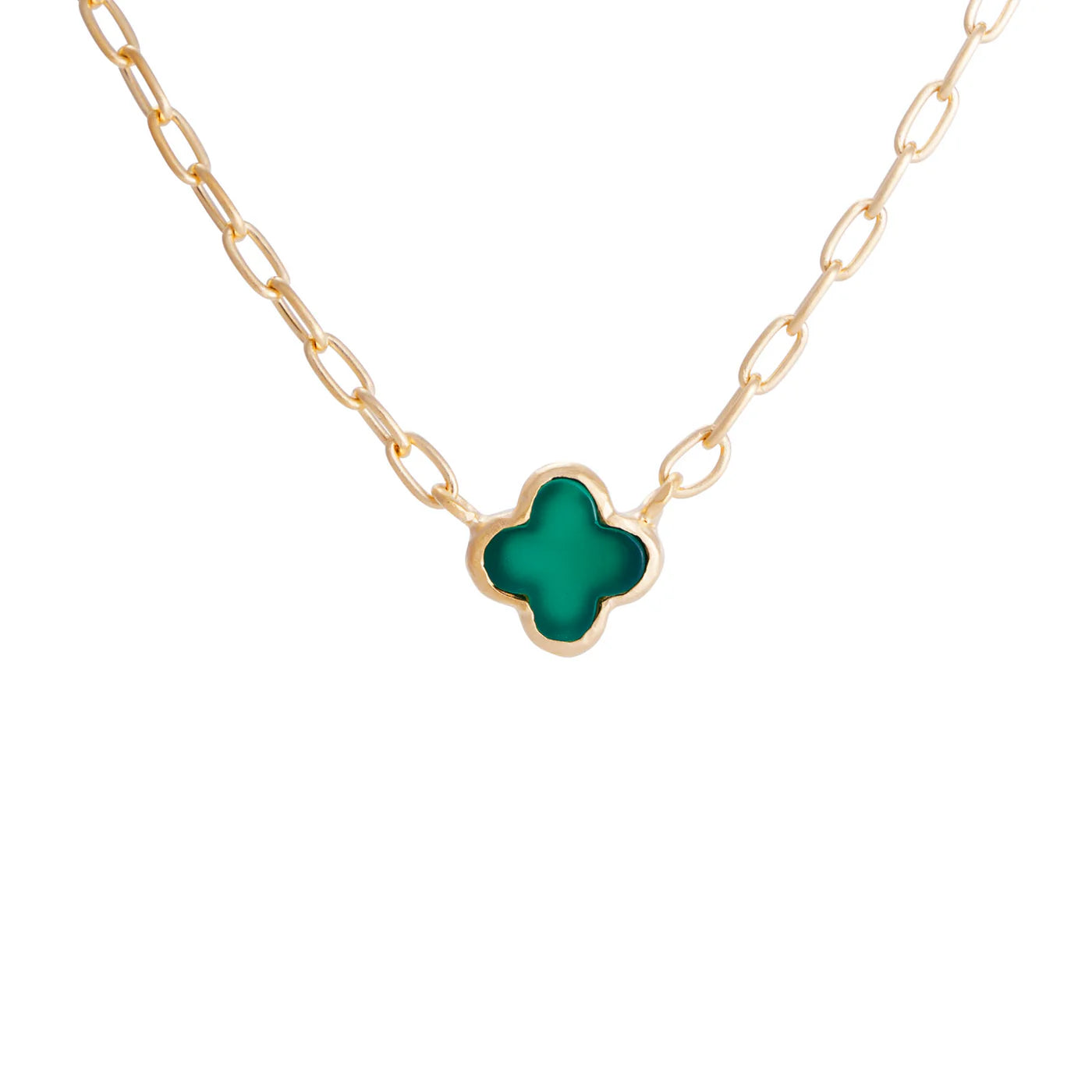 Symbolising luck, hope, and abundance, this charming necklace features three differnt sized delicate four-leaf clovers carved from vibrant green agate. Suspended on a fine chain, each clover brings a touch of natural beauty and timeless sentiment. Perfect for layering or wearing solo, this meaningful piece is an everyday talisman designed to inspire positivity and good fortune.