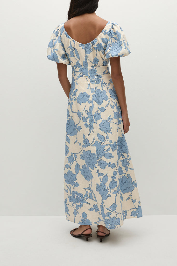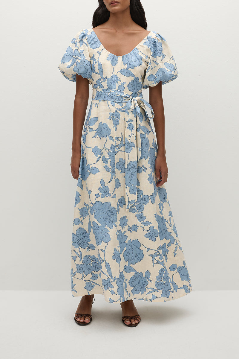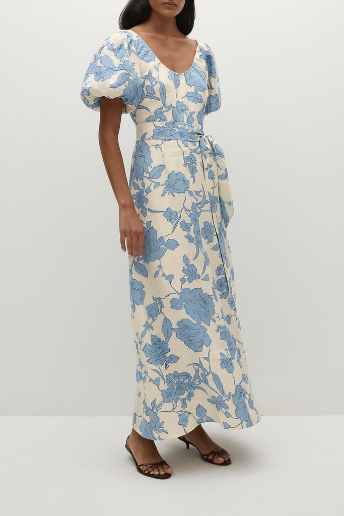 A feminine midi dress with a scoop neckline and oversized rounded sleeves, both elasticated for additional stretch. Semi-fitted through the bodice, it features a tie belt at the waist before falling into a soft A-line skirt that crops around the ankles. Designed from a signature 100% European Flax® linen fabrication in a creamy neutral with a nostalgic blue floral print, style with a kitten heel for day to night wear.