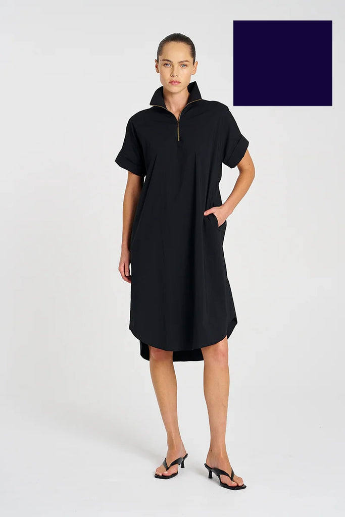 Cut in Mela Purdie's Lightweight Microprene; A crisp, cotton rich fabric with high stretch and a polished finish. The Half Zip Dress features a zip through the collar and curved hemline.