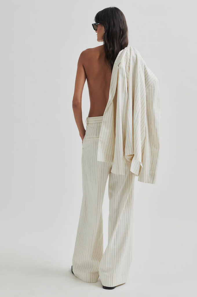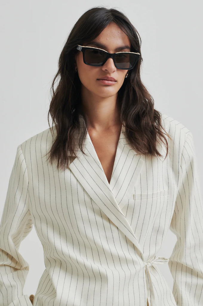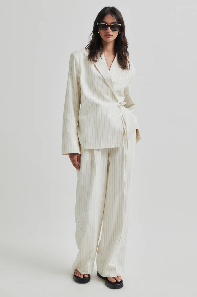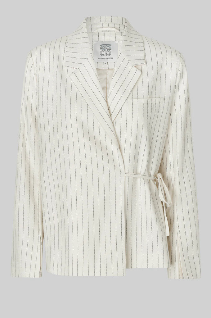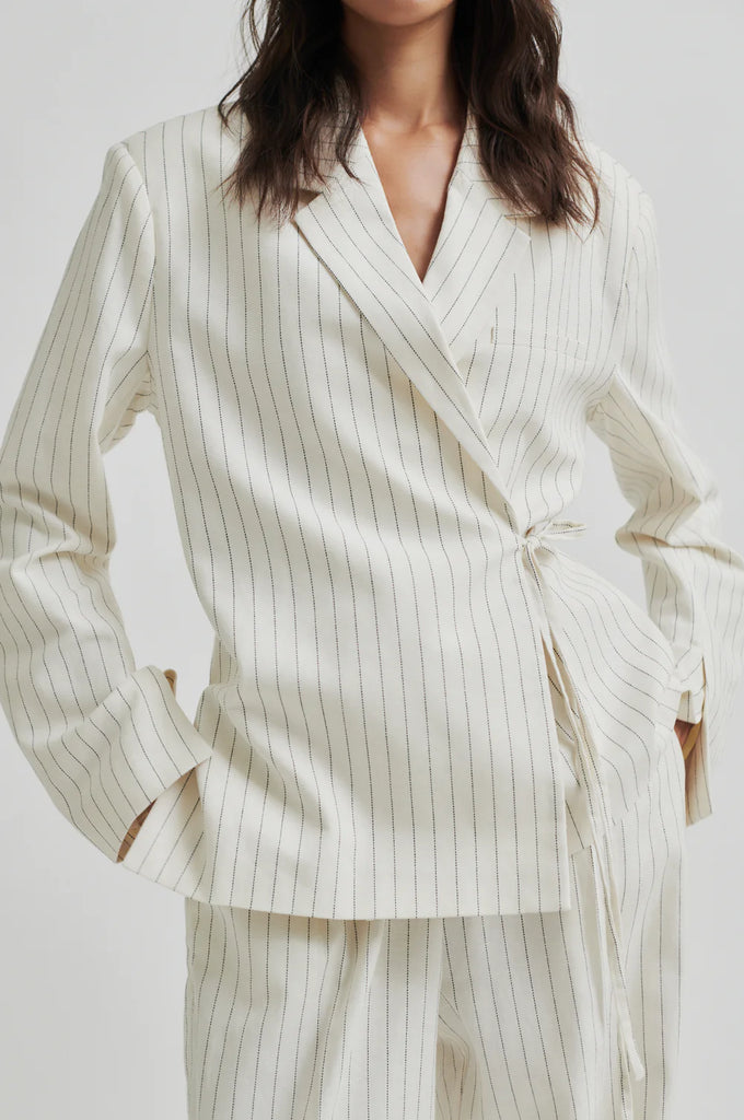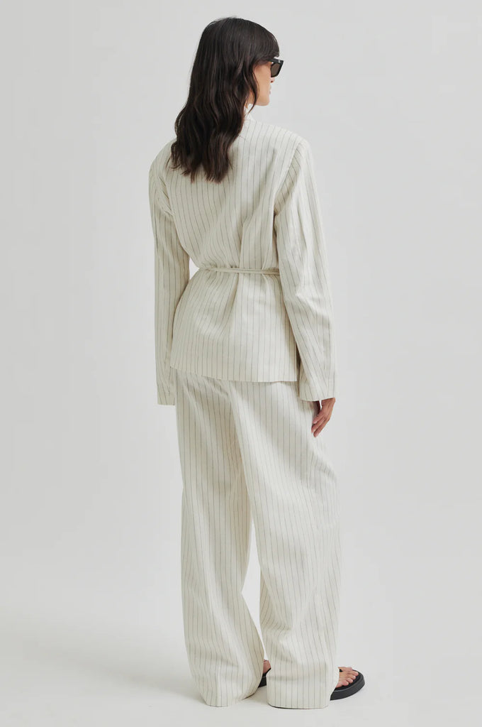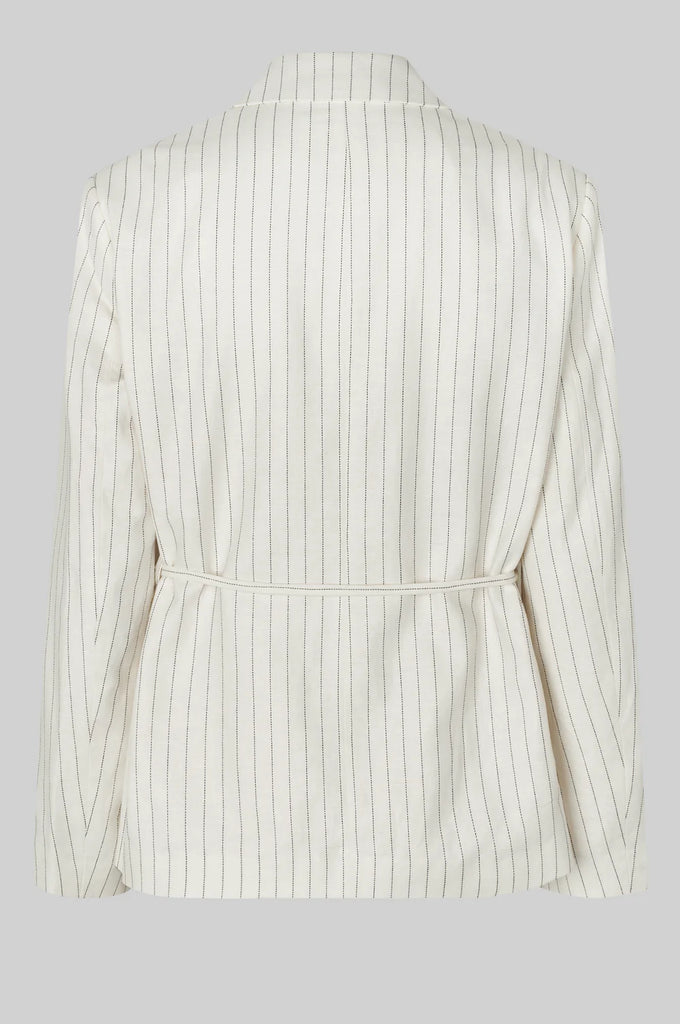Pinstriped blazer made of a cotton-linen blend with a classic fit and notched lapels, but with a modern tie detail at the waist. The blazer features a decorative chest pocket and long slit sleeves. Fully lined.