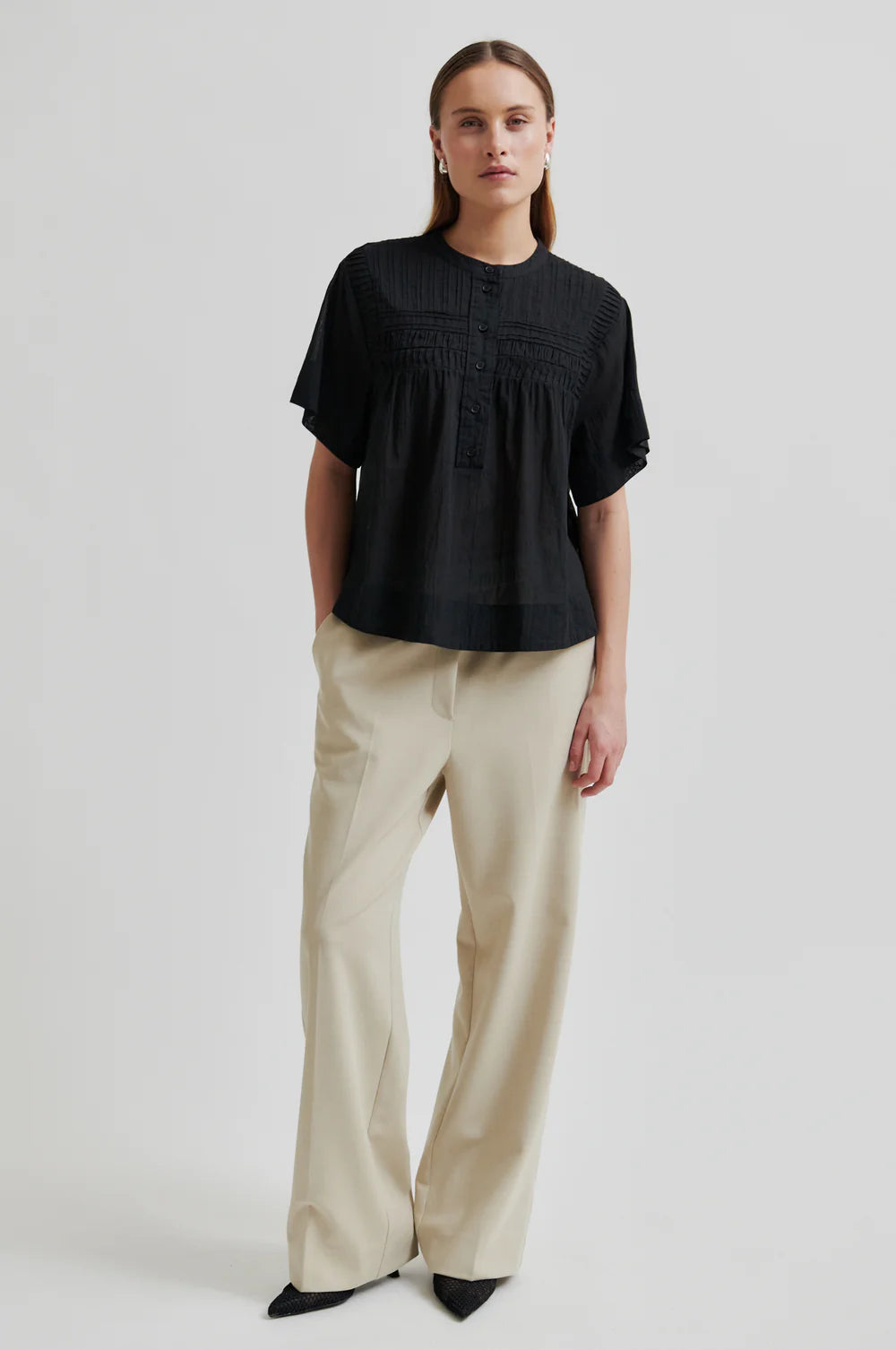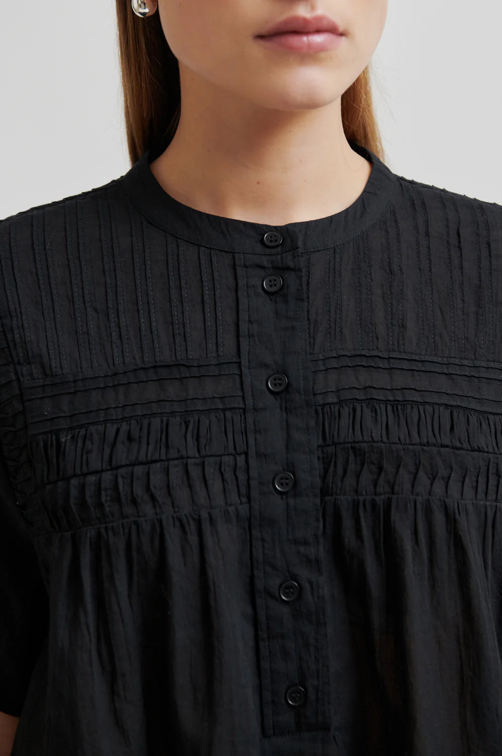 Second Female short-sleeved blouse in smooth, lightweight cotton. Featuring a round neckline and half placket with button fastening. Stitching details at top and shoulders that create structure. Short, wide sleeves. Relaxed and airy fit.