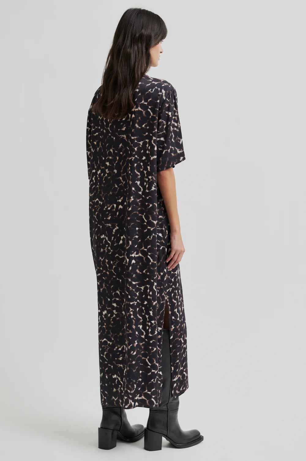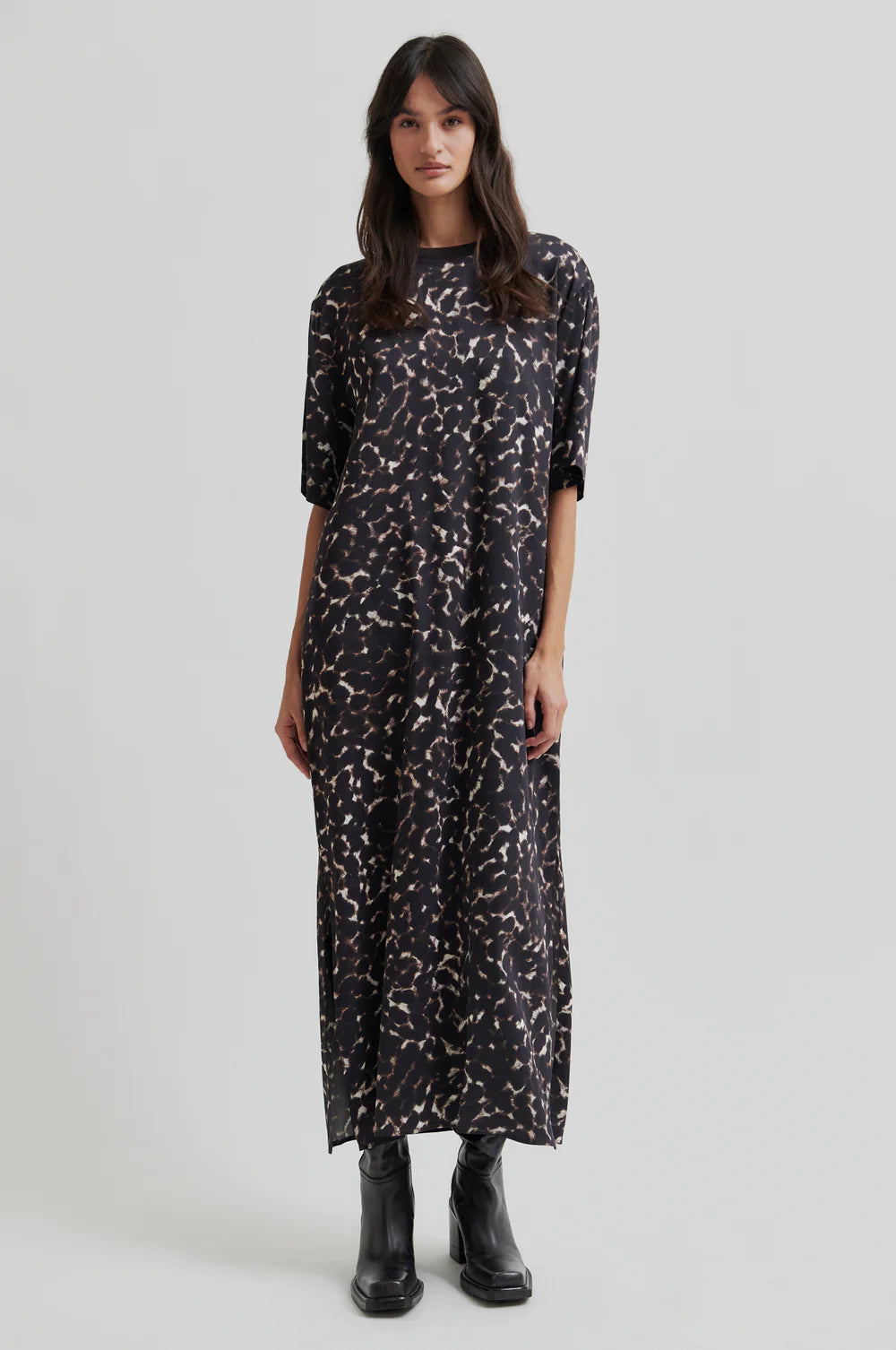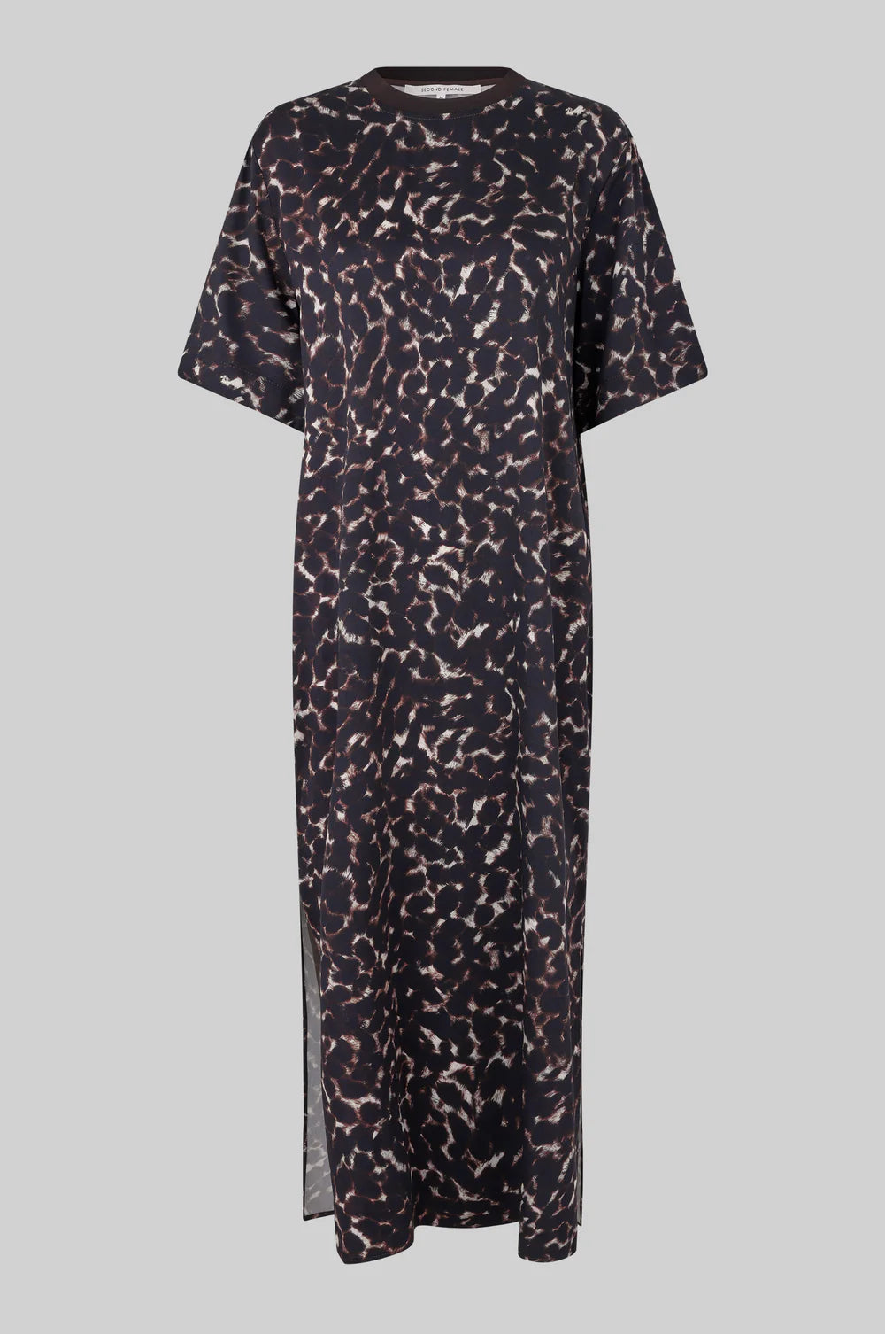 Second Female round-neck printed dress. The dress is made in soft and drapy viscose blend with all-over print. Featuring a round ribbed neck and short sleeves. Deep slits at sides. Regular fit with straight silhouette.
