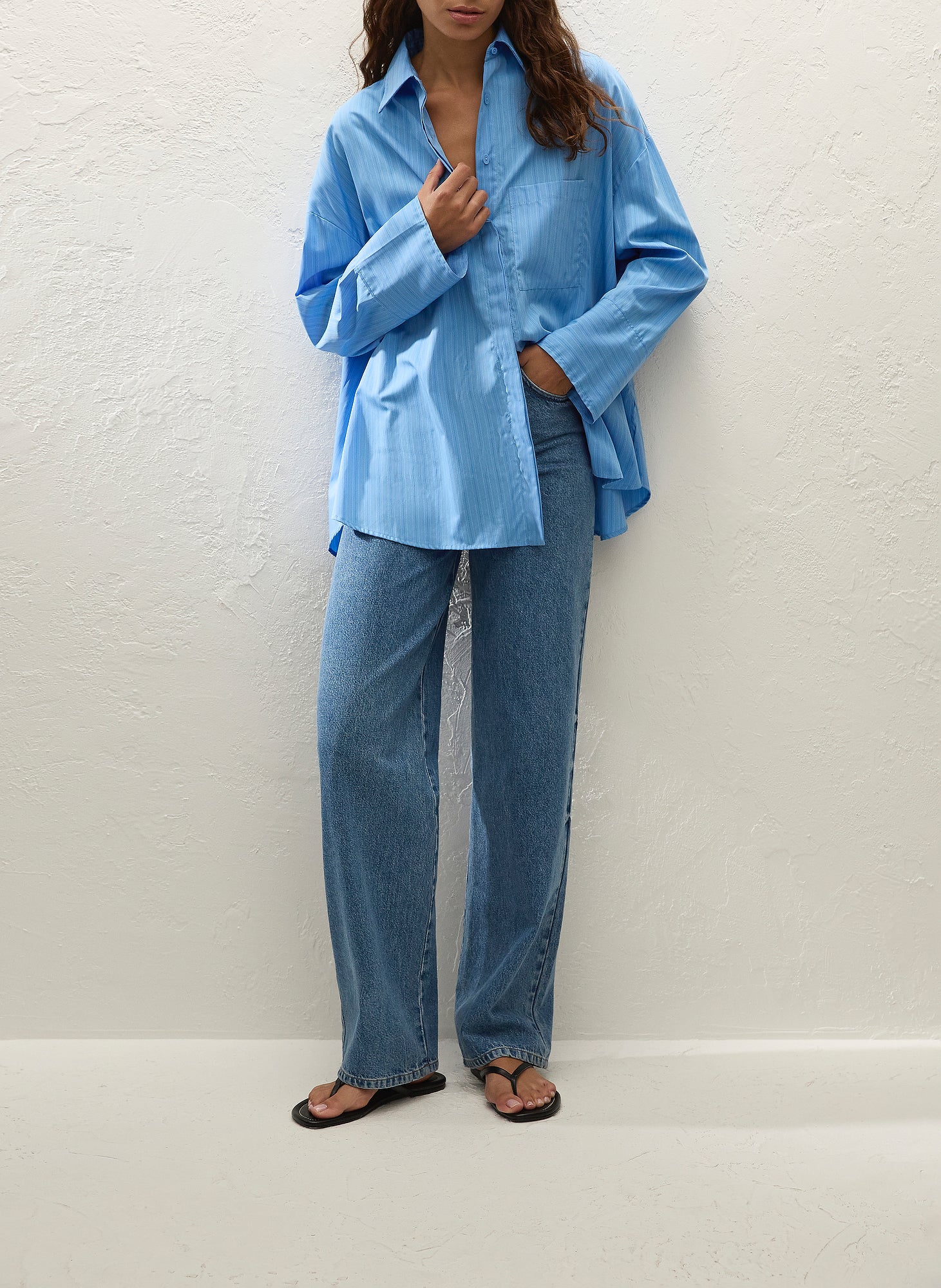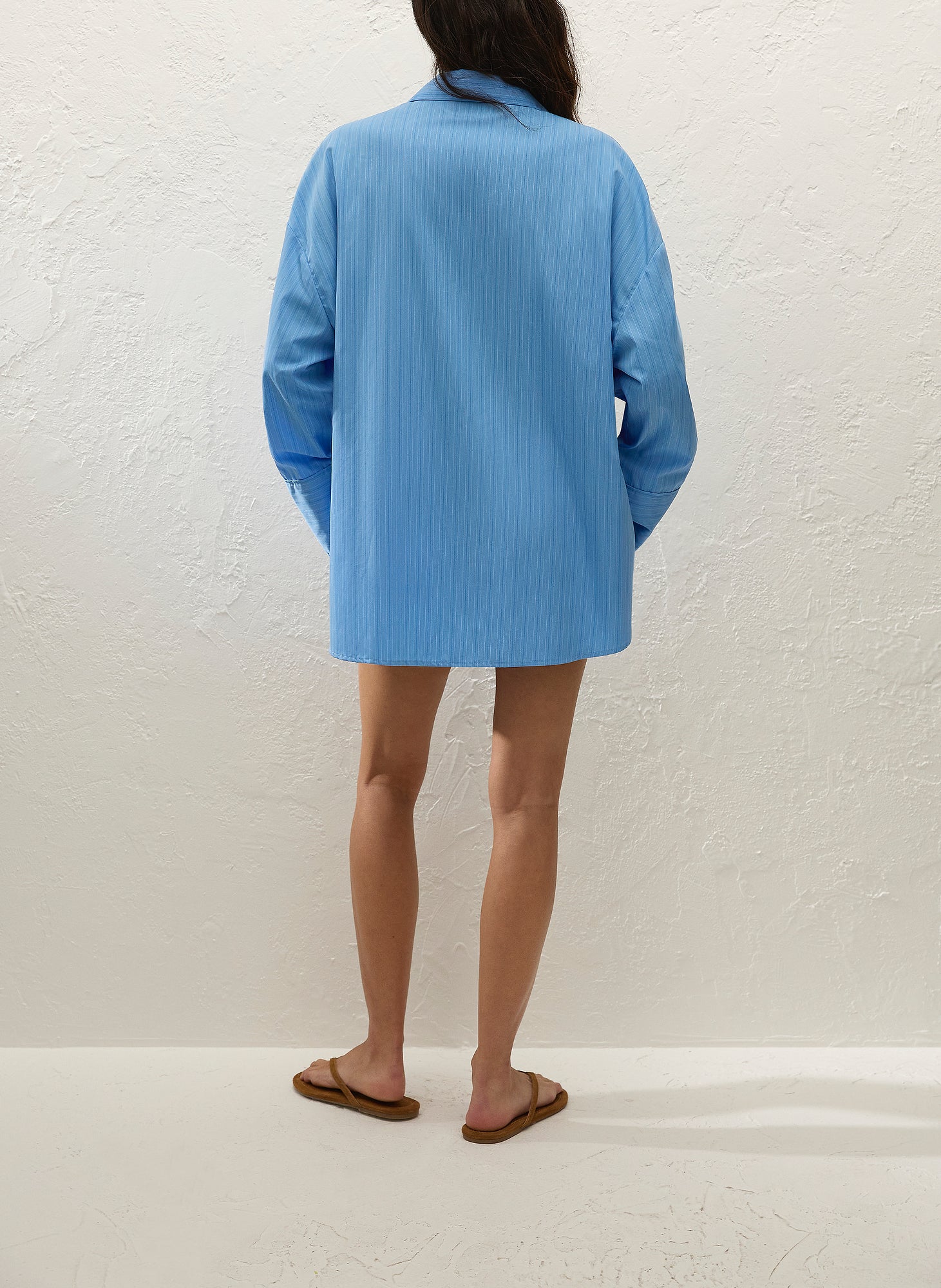 An oversized boyfriend-style button-up shirt, designed from a signature 100% BCI Certified organic cotton, yarn-dyed in a faded yellow and white stripe. Featuring a classic collar and button-up front with a single chest pocket and wide cuff sleeves, it is intentionally relaxed in shape for effortless throw-on throw-off appeal. Style with the matching Lonia Shorts or over swim for long days by the ocean.