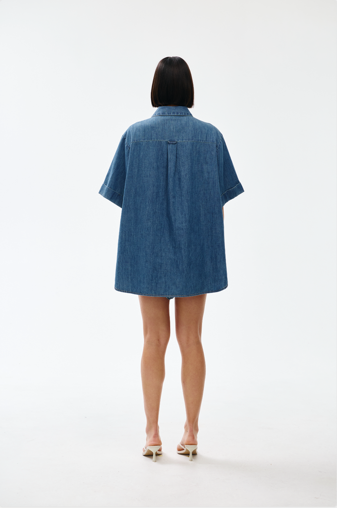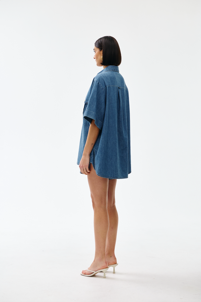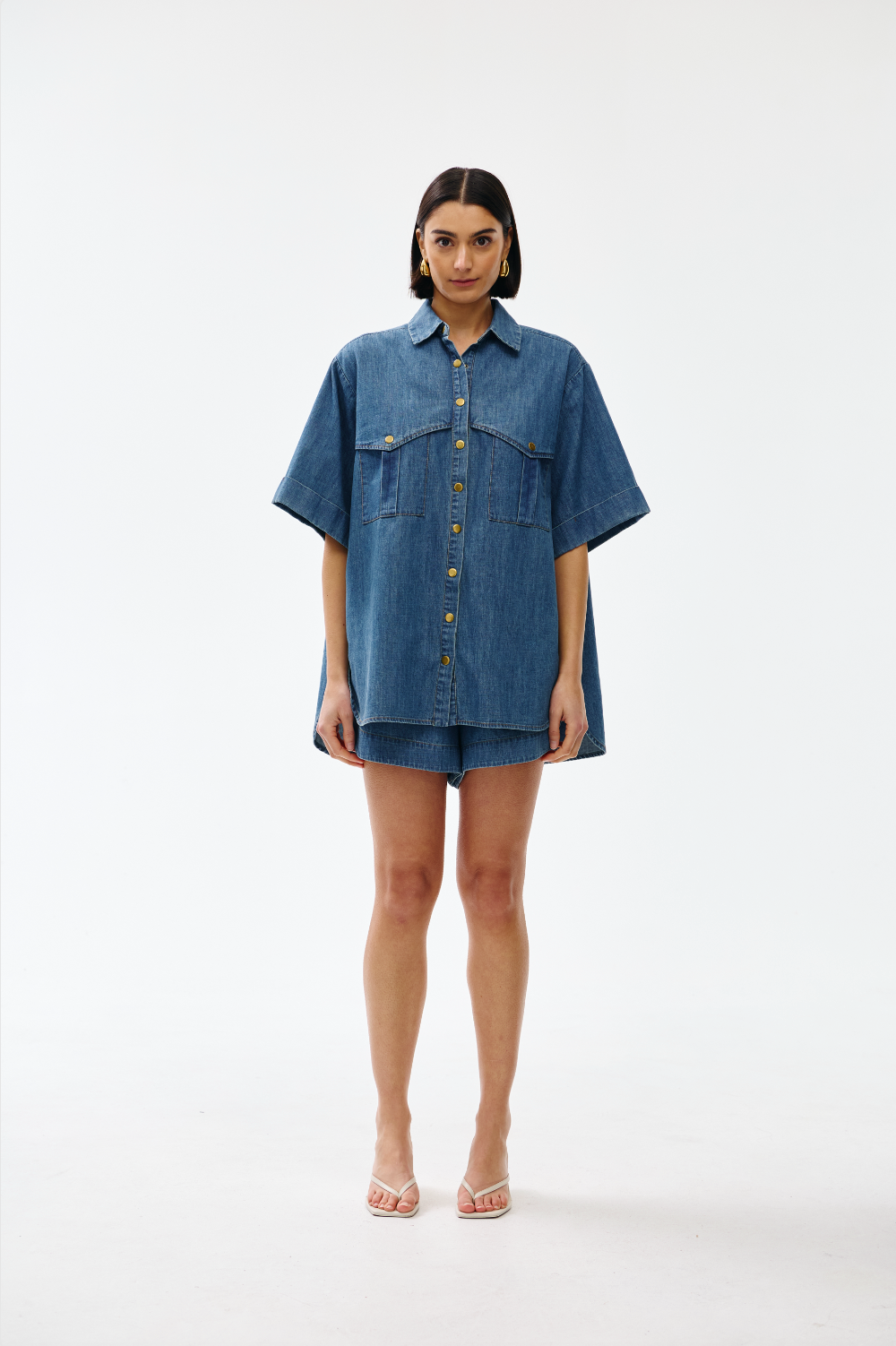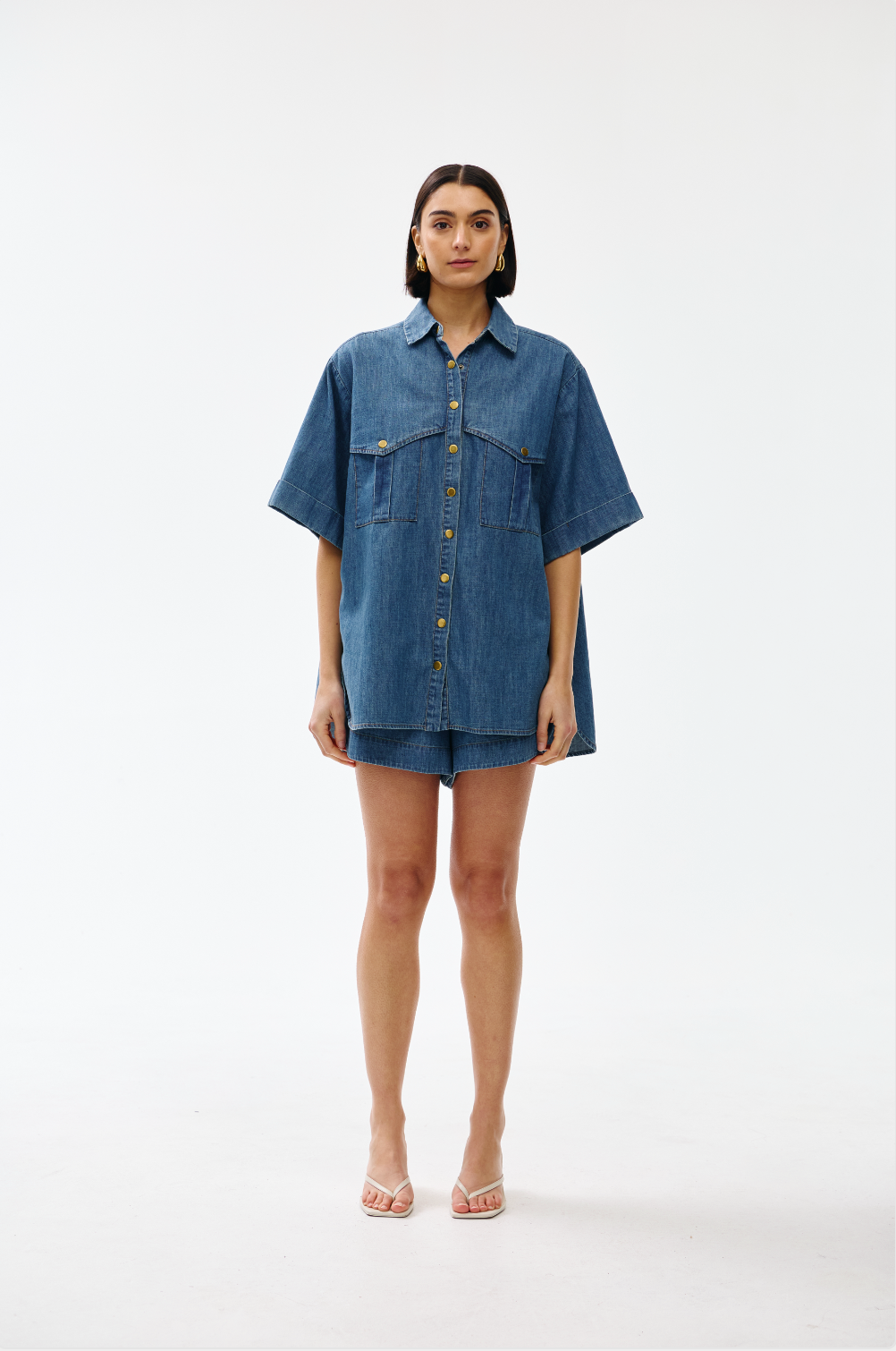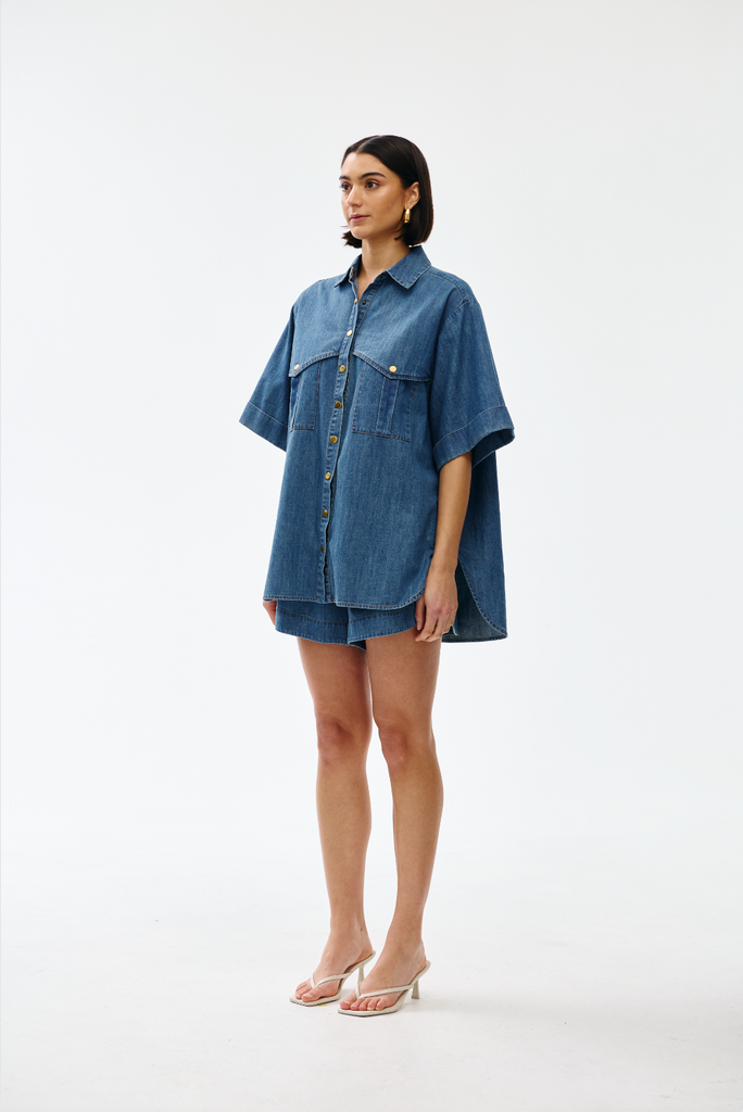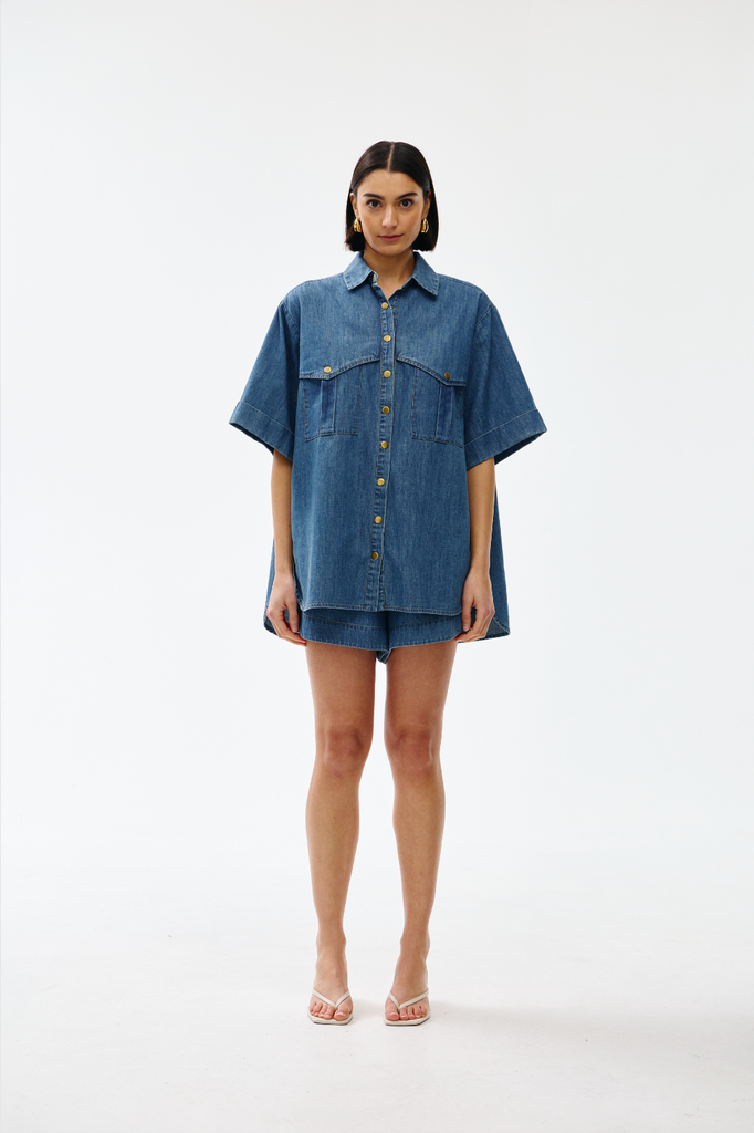 Wide short sleeves and a loose silhouette offer a laid-back fit, while the medium blue wash adds versatility to your wardrobe. Perfect for pairing with matching denim shorts or layering over dresses and trousers, this shirt transitions easily from casual daywear to elevated off-duty looks.