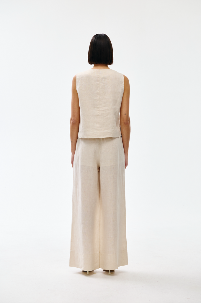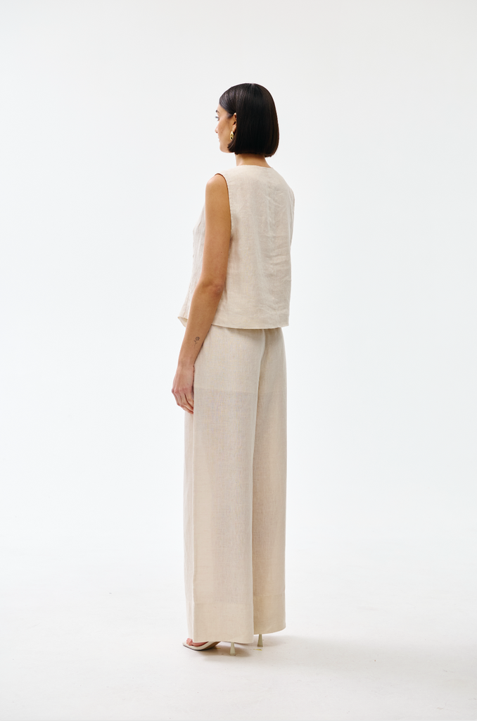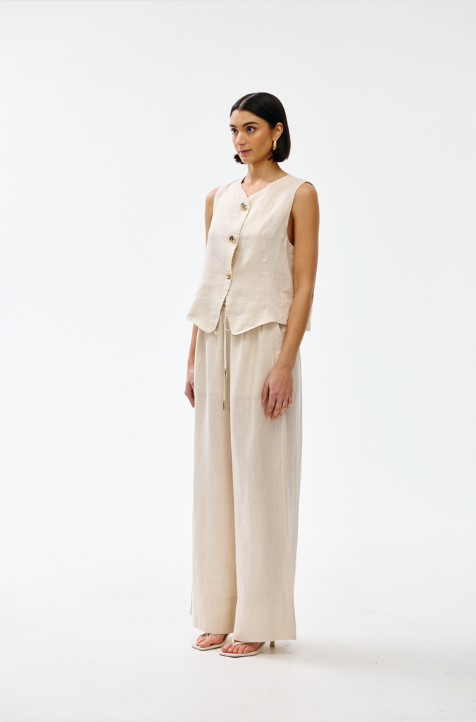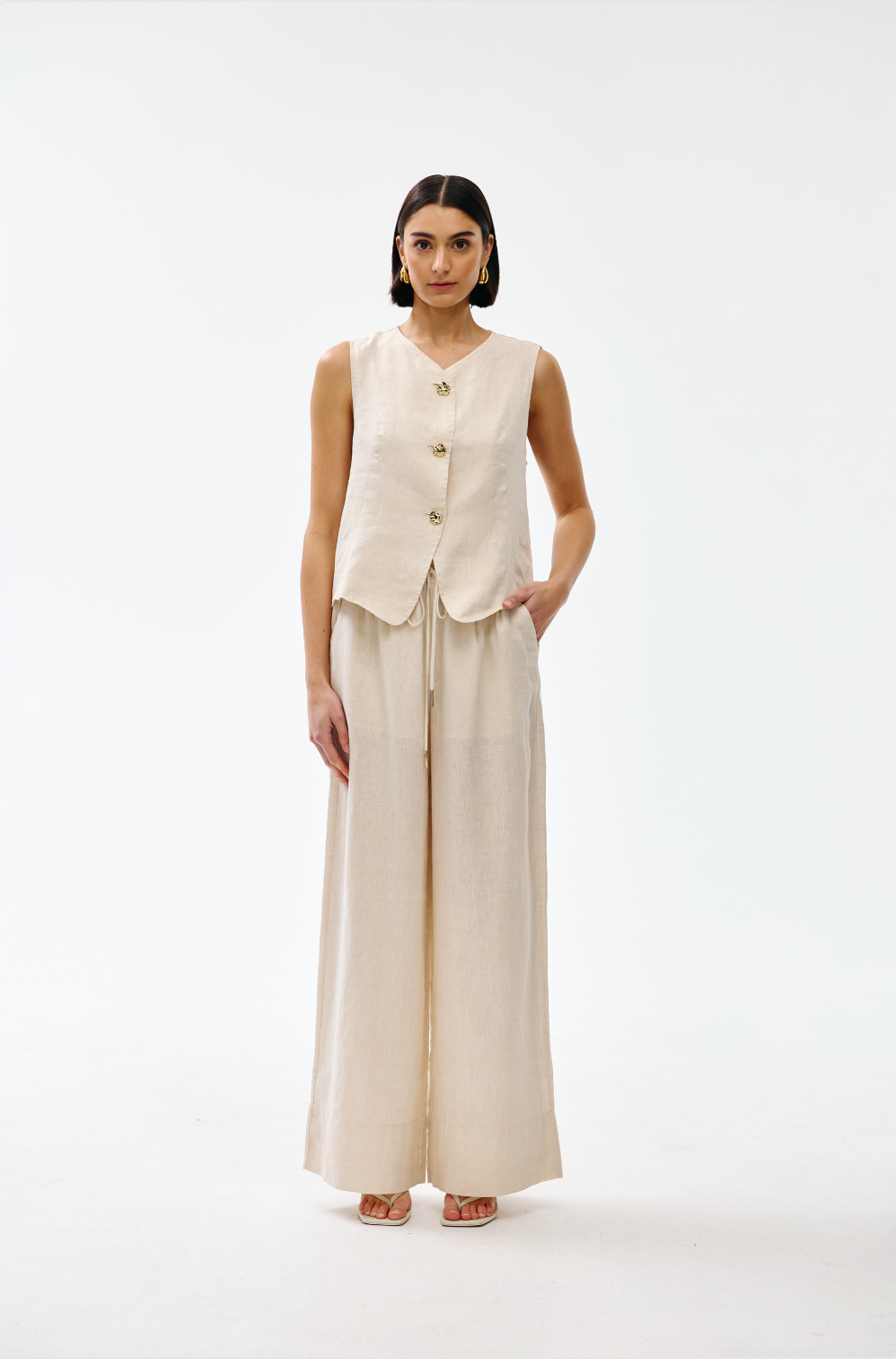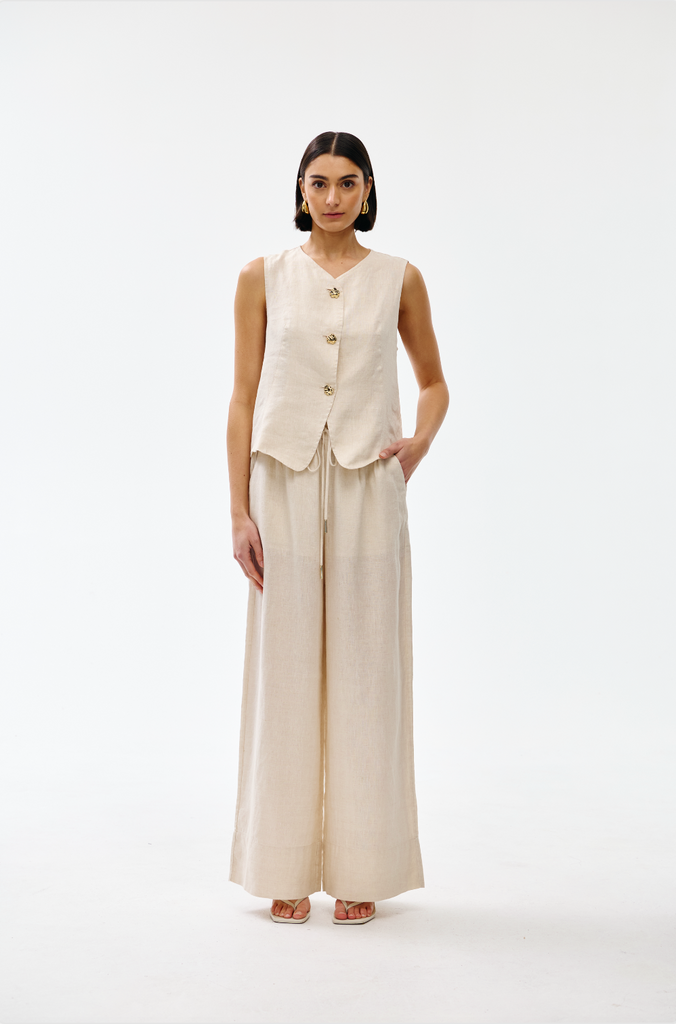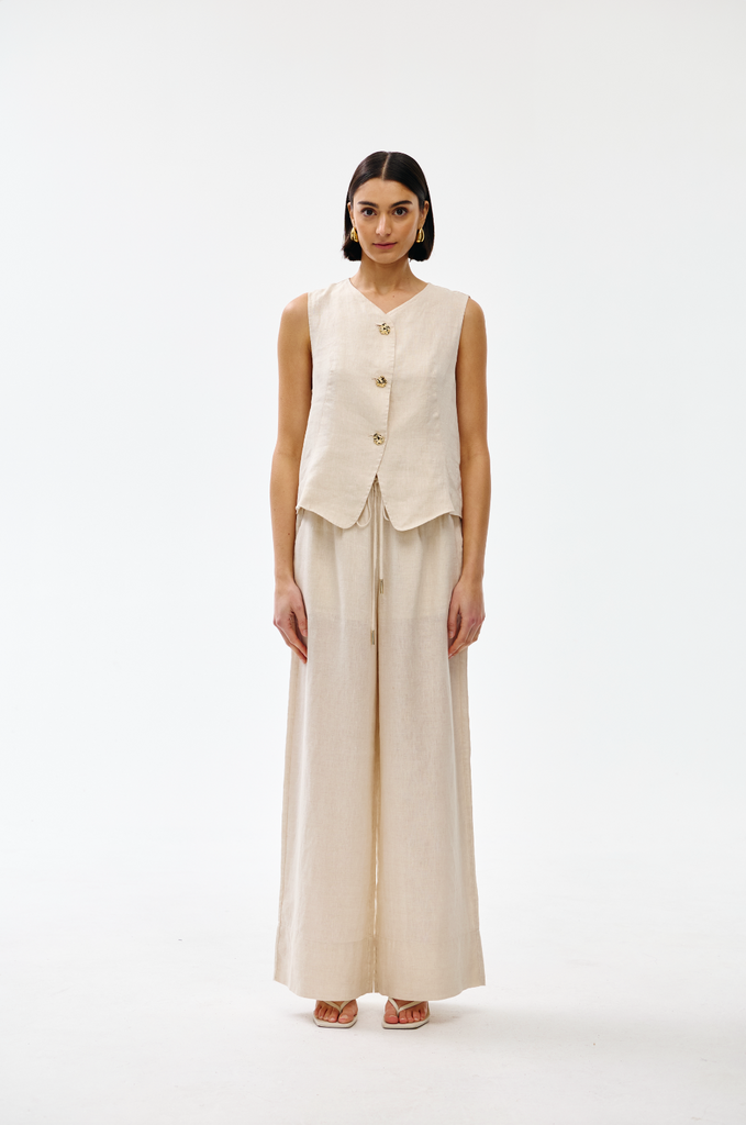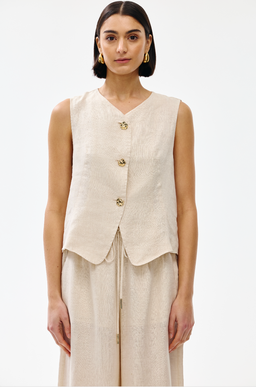Crafted from soft, breathable linen, this sleeveless design features an elegant V-neckline and button front with distinctive gold-toned hardware.